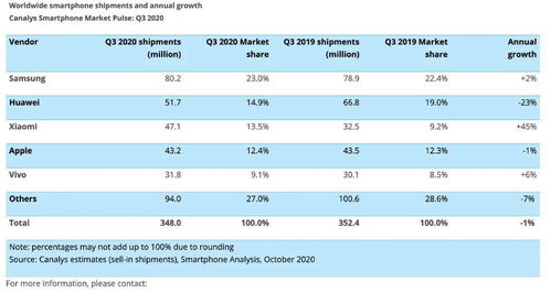 在全球智能手机市场的竞争舞台上,小米手机以其卓越的性能和创新的技术,再次证明了其不可小觑的市场影响力。最新发布的全球智能手机销量排名显示,小米手机不仅在全球市场中取得了显著的成绩,更是在销量上超越了众多国际品牌,报告 2020 年 Q1 全球个人音频设备市场出货量 7590 万台,苹果占比 41成为全球销量最高的智能手机品牌之一。然而,尽管小米在全球市场的表现令人瞩目,但在中国本土市场,它却略显逊色,位居销量排行榜的次席。