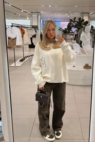 在商店购物时,Molly-Mae抓住机会分享了她的着装细节,包括一件超大的奶油色Loewe运动衫,大胆的豹纹阔腿牛仔裤,一双经典的耐克运动鞋和一个光滑的黑色香奈儿手袋。5月5日周日,她在Instagram上与790万粉丝分享了这张照片,并配文:“psa——我的牛仔裤在亚马逊上卖15英镑。”