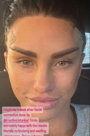 周日晚上,这位五个孩子的妈妈在Instagram上分享了一张自拍照,展示了她最新手术的结果。在其他照片中,这位明星被绷带包裹着,但现在伤口开始愈合,她对自己的新形象很满意。46岁的凯蒂太阳穴上仍然贴着膏药,但她似乎对最近花费1万英镑进行的手术印象深刻。