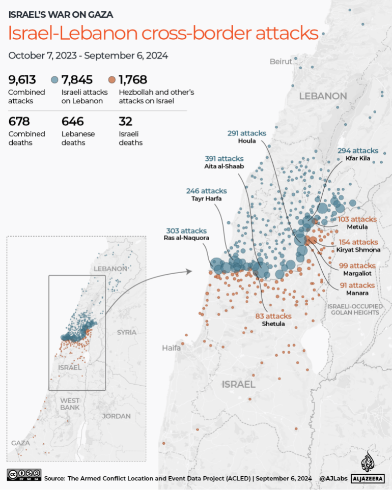 根据“武装冲突地点和事件数据”(ACLED),从去年10月7日到9月6日,以色列与黎巴嫩真主党等武装团体至少发生了9613次袭击。