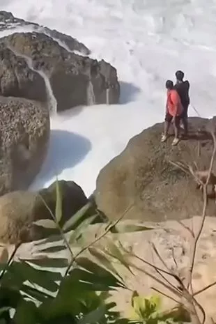 令人震惊的图片显示,一名游客在摆姿势拍照时被巨浪击中,并被卷到海里。