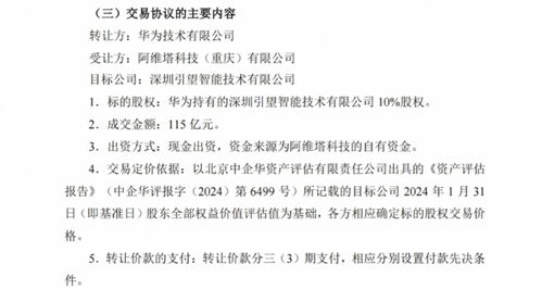 昨日晚间,重庆长安汽车股份有限公司在发布公告中宣布,其联营企业阿维塔科技计划于8月20日与华为签署《股权转让协议》,购买华为持有的引望公司股权,交易金额达到115亿元人民币。