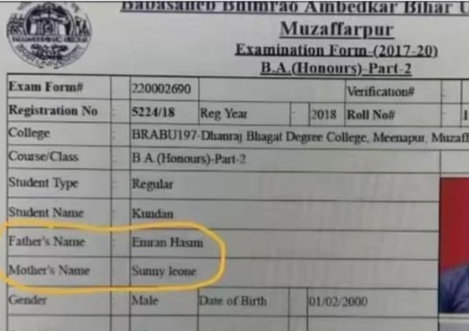 一名来自比哈尔邦穆扎法尔普尔的学生因在自己的学士学位考试表格上填写宝莱坞演员的名字作为父母而走红。