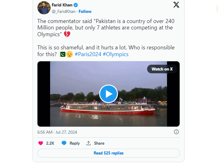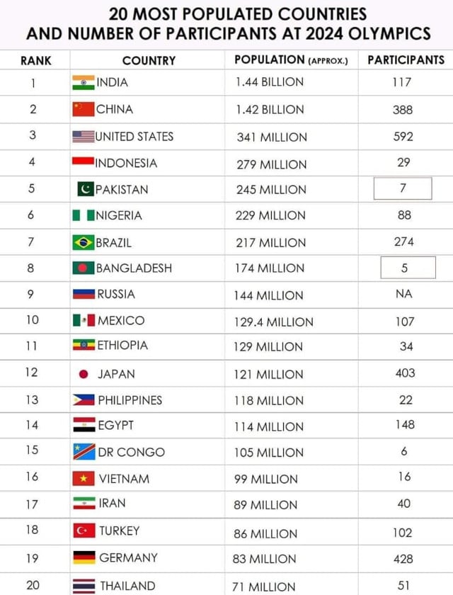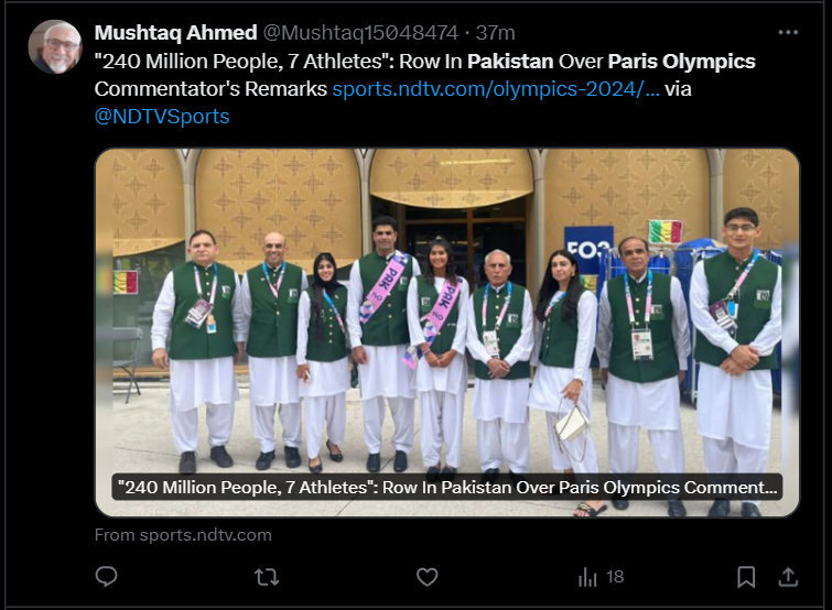 讽刺的是,当评论员指出:“巴基斯坦是一个拥有2.4亿多人口的国家,但只有7名运动员参加奥运会。”