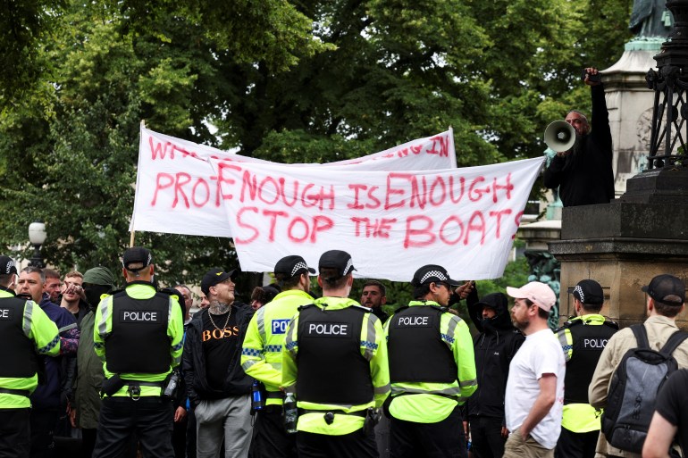 在英国国内,以假名汤米•罗宾逊(Tommy Robinson)活动的斯蒂芬•亚克斯利-列侬(Stephen Yaxley-Lennon)和领导民粹主义改革运动的议员奈杰尔•法拉奇(Nigel Farage)等人物被指控散布阴谋论和虚假信息,助长了骚乱。
