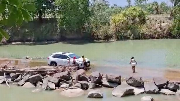 动物园工作人员布兰登·达里森-霍斯金周六在参观现场时,发现这三个人把车停在河中央渡口拍照