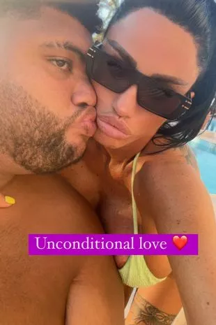 凯蒂·普莱斯与男友JJ·斯莱特以及她的大儿子哈维一起度假时,展示了她最新的造型
