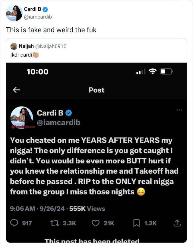 Raptress Cardi B最近回应了网上关于她与已故说唱歌手“起飞”有染的谣言。