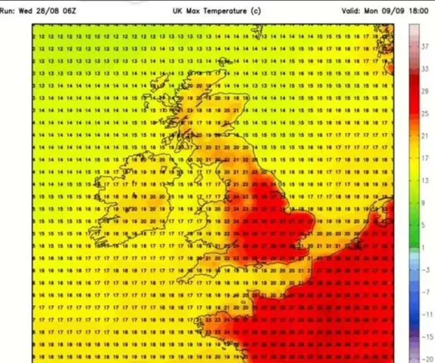WXCharts发布的最新天气图显示,英伦三岛部分地区的气温高达33摄氏度,呈红色,目前的高温将持续到9月份
