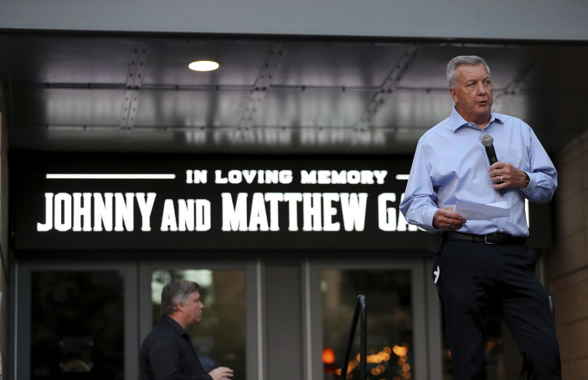 2024年9月4日,星期四,在俄亥俄州哥伦布市的国家体育馆外,哥伦布蓝夹克队总经理唐·瓦德尔在烛光守夜活动中向蓝夹克队的冰球运动员约翰尼·高德罗致敬。美联社图片/Joe Maiorana