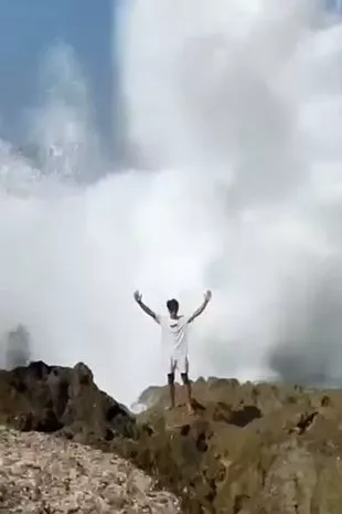 令人震惊的图片显示,一名游客在摆姿势拍照时被巨浪击中,并被卷到海里。