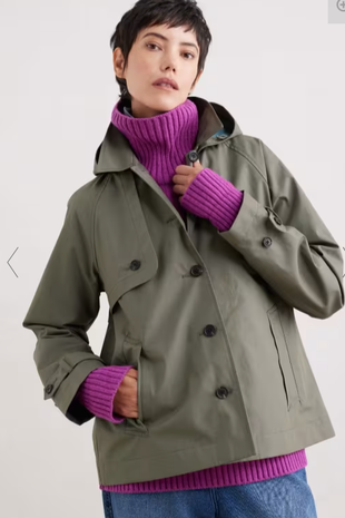 在评论中,一位购物者写道:“我一直在寻找一件短风衣,Seasalt符合我的要求。这颜色真漂亮。合身程度惊人,与尺寸相符,衬里很华丽。