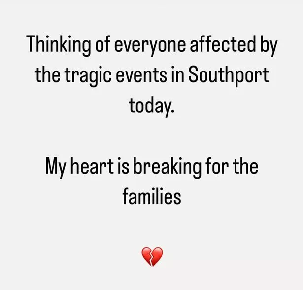 来自默西塞德郡小镇的前BBC电台1台DJ阿黛尔周一在X上分享了她对受这一可怕事件影响的人的支持。她写道:“想到今天在绍斯波特发生的悲惨事件中受到影响的每个人。我为这些家庭感到心碎。”