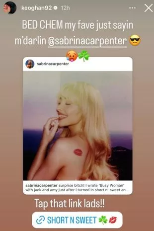 本周,萨布丽娜·卡彭特的最新专辑发行后,巴里·基奥根对她表示了支持,此前有人猜测他们已经分手。