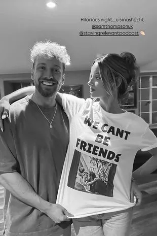 莫拉穿着这件上衣,为皮特和他的朋友山姆·汤普森加油,当时他们正在哈默史密斯阿波罗现场录制他们广受欢迎的stay Relevant播客。莫拉在Instagram Story上分享了自己穿着这件衬衫的照片,她写道:“滑稽的夜晚……你把它砸了。”(原文如此)