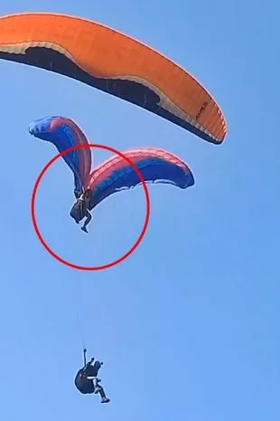 警告-令人痛心的镜头:在巴西圣保罗,卢卡斯·里贝罗·马塞多被另一名男子的降落伞绳缠住了,这段令人震惊的镜头捕捉到了这一刻