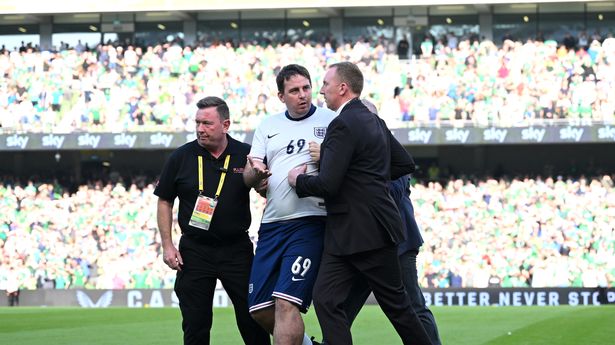 贾维斯穿着全套英格兰队服进入了都柏林英杰华体育场的球场,很快就被保安逮捕了。贾维斯在社交媒体上分享了自己被带走的照片,并写道:“我现在是英格兰有史以来最胖的足球运动员!!”