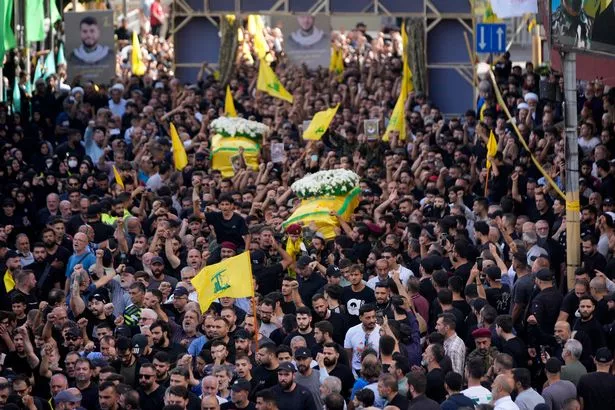 真主党成员抬着两名战友的棺材,这两名战友在周三的手持设备爆炸中丧生(图片:版权所有2024年的美联社。版权所有)