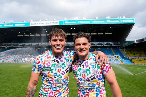 在魔术周末战胜索尔福德红魔后,利豹的基南·布兰德(左)和拉克兰·拉姆(Hassell设计形象:奥利/ SWpix.com)