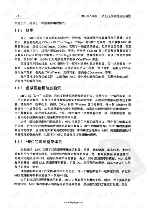 MFC(Microsoft Foundation Classes)是微软开发的一套用于Windows操作系统的C 编程框架。它为开发人员提供了一套面向对象的 API,用于创建图形界面应用程序。MFC编程的原理包括以下几个方面:1. 对象模型:MFC使用了面向对象的编程模式,其中的核心概念是类和对象。MFC提供了许多基类和派生类,开发人员可以通过继承这些类来创建自定义的窗口、对话框和控件等。2. 消息映射机制:MFC中的消息映射机制允许开发人员通过处理消息来响应用户的操作。每个窗口或控件都能接收消息,并根据不同的消息类型执行相应的操作。开发人员可以通过重写基类中的消息处理函数来实现自定义的消息…